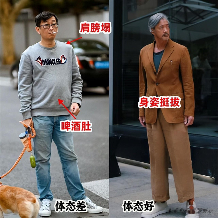 有没有发现一个现象?就算精心打扮了自己,可好多中年男人呈现出的气质还是大相径庭,关键可能就在于体态的差别。