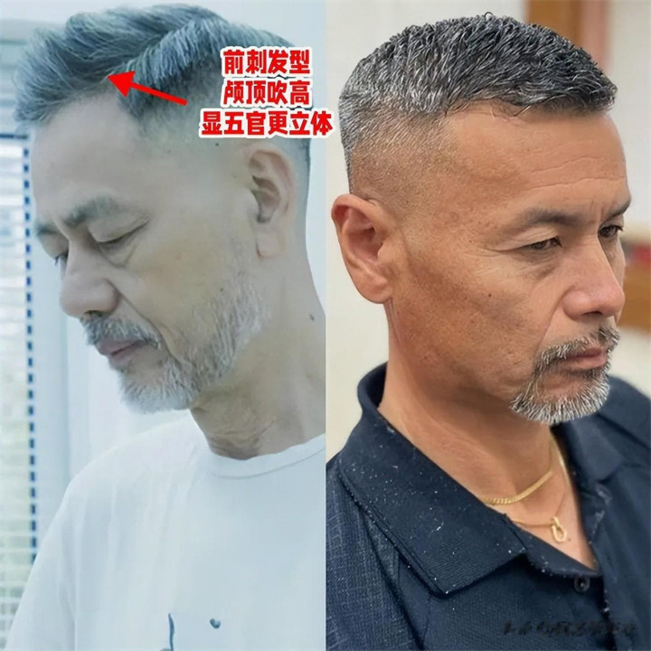对于中年男人来说,换发型没那么多复杂的技巧,只要保持简洁清爽利落就行了,比如这种清爽的寸头或者前刺发型,把头发剪短特别好打理,露出额头,颅顶吹高,也能一定程度修饰我们的脸型,凸显五官的立体度。